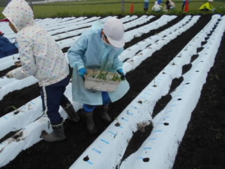 まずは畝づくり。手作業でみんな協力し、一生懸命掘りました!畝ができたら、今日は「ミニトマト」「きゅうり」の苗植え。ポットからやさしく取り出し、土の中へ!最後にみんなでたっぷり水あげ!!「疲れた~」と汗だくの子どもたちは、最高の笑顔でした。