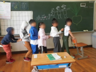 「だれが、だれを」をしっかり捉えながら、実際にやってみました。とても楽しそうに、体を動かし、学ぶ姿が見られました。