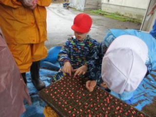 その後に縦割り班ごとに作業が始まりました。下級生は上級生に教わりながら作業を進めます。班の中で分担して、育苗箱に土を入れたり、種を一粒一粒まいたり、最後に土をかけたりしました。