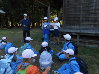 権現神社で帰りの会を。往復14キロのコースを歩き、風天様に登り帰りの会では疲れた様子も!