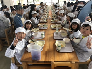 2019年10月25日(金) 交流給食(マツタケ給食)交流給食が行われました。日頃、給食の関係でお世話になっている方やマツタケの収穫でお世話になった方、地域の関係者の皆さんを招いての松茸給食です。 今年は松茸が不作で、なかなか収穫できない中、2kgを給食で使ったそうです。今年は1kgが20万円ほど・・・。 もし買っていたら・・・。とっても贅沢な給食になりました。 収穫をしてくれた6年生とマツタケ山を管理してくださった皆さんにも感謝です。 全校で秋の味覚を味わいました。ごちそうさまでした。