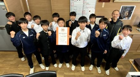 〇12月4日(月) 東信地区中体連新人大会で3位になったサッカー部の皆さんが校長室に来てくれました。地区の上位チームが出場するチラベルト杯でも健闘し、予選突破もあとわずか!、というところまで頑張ったそうです。サッカー部の皆さんは練習中にグランドに行くと、「おはようございます」とか「こんにちは」と、大きな声であいさつしてくれます。これは、3年生が練習に出ていた頃と何ら変わりません。むしろ、「もっと頑張らなくちゃ!」という気持ちがビシビシ伝わってきます。今日はこの校長室で、皆さんの元気な力強い姿を見ることができましたが、来春は、ひと冬越えて心身ともにもっと成長した姿となり、再び校長室を訪ねてくれることを期待しています!サッカー部諸君、"冬"と勝負だ!