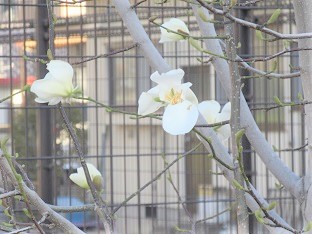本校の校歌です。校歌にある「純情の花」(こぶしの花)が咲いています。