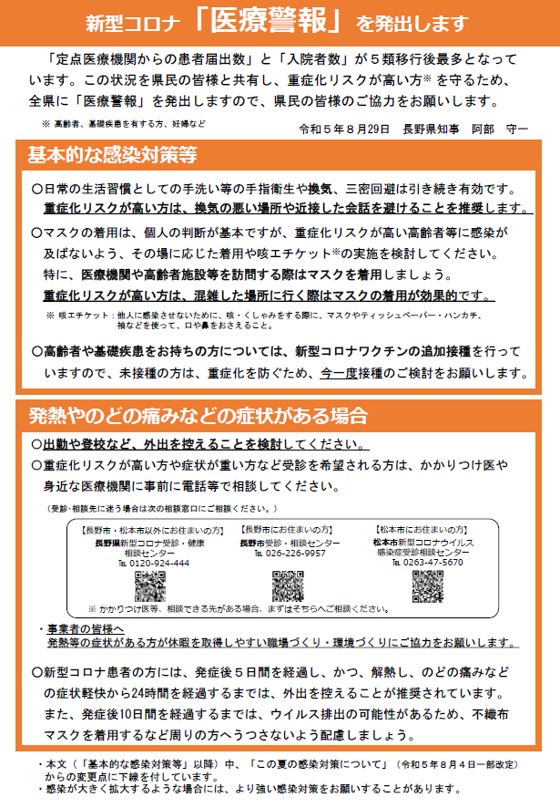 2023年8月31日(木) ご注意ください!上小管内 新型コロナ感染者急増中です