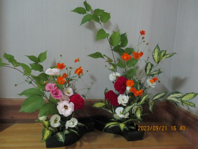 今月のお花は 白山吹(しろやまぶき)、キバナコスモス、鶏頭(けいとう)、トルコキキョウ、ゴッドセフィアナです。腰原さんが明日からの文化祭に合わせて本日花を生けに来てくださいました。何というお気遣いでしょう!来てくださる保護者の皆様や地域の皆様が気持ちよく文化祭を楽しんでいただける一助になります。ありがたいことです。黒の器も秋らしく、さまざまな角度からお花を楽しむことができる波形のものです。