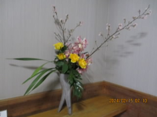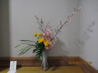 腰原さんのアレンジによる2月のお花です。花材は啓翁桜(けいおうざくら)、シンビジウム、バラ、クッカバラです。シンビジウムや黃色のバラといった主役級の花が色味を発する中ですが、今回の主役は啓翁桜ではないでしょうか?卒業式、入学式と、別れや出会いをイメージさせられます。
