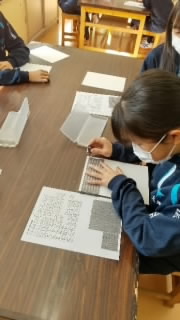 学校では、1年生は人権学習の一環で、アイマスク体験や車いす体験、点字の実習等を行いました。