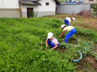 2019年7月18日(木) 4年生 ジャングル草取り雨の多い今年は、本当によく草が茂っています。 木曜日は朝から草取り.全校草取りで円形花壇をやった後にさつまいも畑の草取り。 よし「ジャングル行くぞ!」草のすごさを知っているので、自然とそんな言葉が出てきました。 大きく深く根の張っている草は、本当に手強く、渾身の力で抜いてようやく抜ける位でした。みんな顔中汗だらけ。 それでも約1時間、このあとはプール。それを楽しみに頑張りました。