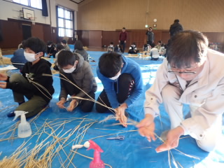 木曜日、5、6年生といっしょに地域の方に教えてもらいながら、わら馬を作りました。