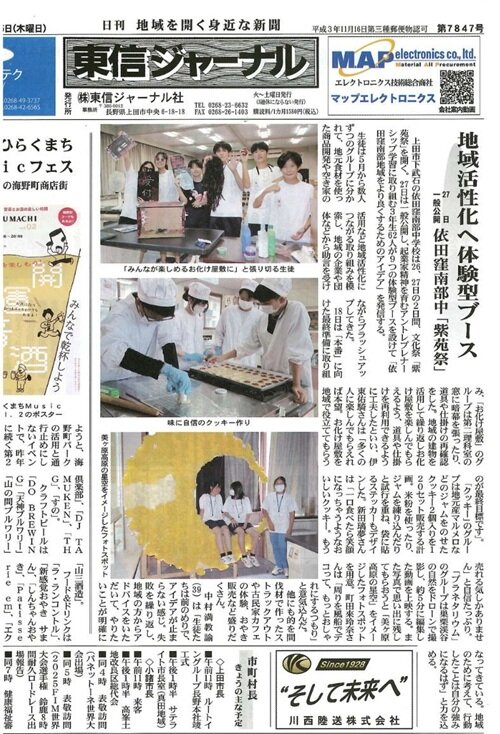 3年生のアントレ学習の様子は、地域広報誌を通じて地域にお住いのみなさんにもお伝えしています。先日は、表紙に掲載され、また生徒が作成した記事を載せてもいただいています。