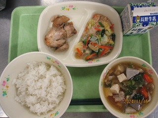 11月15日(金)は地域食材献立です。上田地域・長門地域の食材をふんだんに取り込んだ給食でした。 献立は、ごはん・バーベキューチキン・なめたけのあえもの・けんちん汁・牛乳です。バーベキューチキンは、長和町でとれたりんごをソースにしてからめたジューシーな味わい。けんちん汁には武石でとれた野菜がたくさん入っていて具たくさん。そして、新米のごはん。ふわふわでもっちりとした味わいでした。 心もからだも温まるそんな献立をおいしくいただきました。
